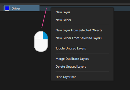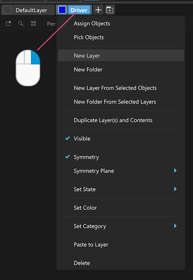 たとえば、レイヤまたはレイヤ フォルダを左マウス ボタンでクリックすると、オブジェクトをすばやく選択してレイヤに割り当てるオプションや、シンメトリのオン/オフを切り替えるオプションを表示できます。