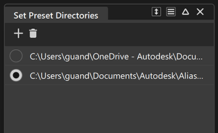 ヒストリ プリセットを作成する前に、プリセットの保存場所を設定できます。既定では、Alias は C:\Users\username\Autodesk\Alias フォルダ内に Preset フォルダを自動的に作成します。