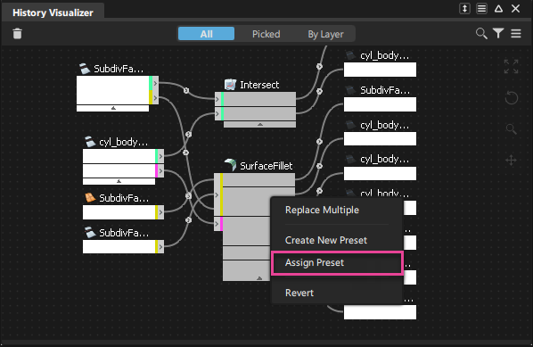 ヒストリ プリセットは、アクティブなコンストラクション ヒストリを持ち、ソース ツール ノードとタイプが同じであるツール ノードに適用できます。たとえば、Surface Fillet ツール ノードから作成されたヒストリ プリセットを適用できるのは、別の Surface Fillet ツール ノードのみです。