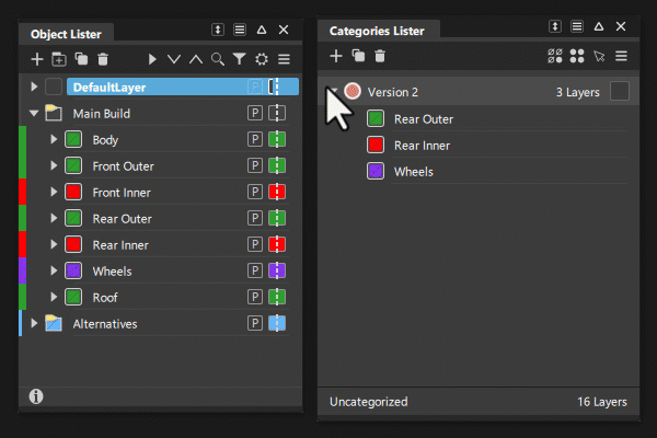 Categories Lister を開きます。このリスターでは、複数のレイヤをカテゴリ グループに整理できます。これは、特定のコマンドを 1 つまたは複数のモデリング レイヤに頻繁に適用する場合に便利です。