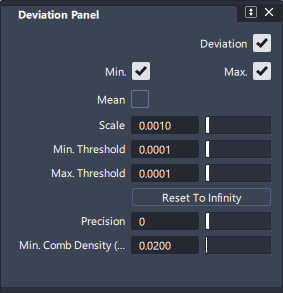 Min. Threshold値より大きく、Max. Threshold値より小さい偏差だけを表示します。Min、Max、Mean ロケータが必要に応じて調整されます。これらの値を使用して、スキャン/セクション データから「不正なポイント」を取り除いたり、特定の範囲内の値を強調表示します。これらの値を調整した場合、キャンバス内マニピュレータのしきい値にのみ適用されます。