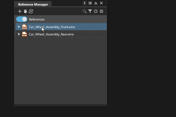 | リファレンス ソースは .wire ファイルです。Reference Manager で最上位のリファレンス ノードを並べ替えるには、中マウス ボタンを押しながら上下にドラッグします。 | |