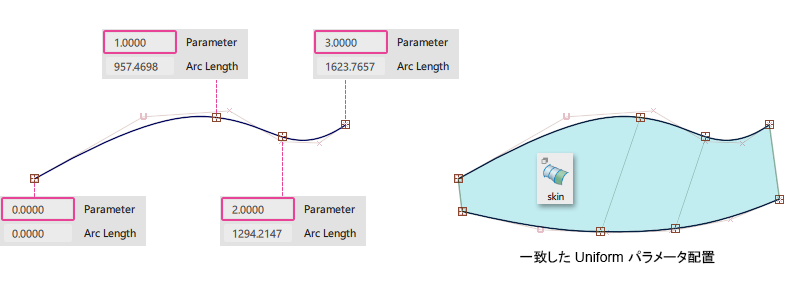 Chord パラメータ配置とは異なり、Uniform カーブのパラメータは実際のカーブ長とは関係ありません。