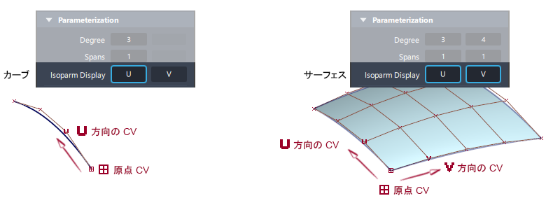 原点 CV と以降の CV では、U 方向と V 方向を示すために使用される CV 記号