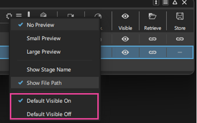 ファイルを開いたり読み込んだりする際に、ステージの既定の表示/非表示設定を制御できるようになりました。Stage Editor 設定に新しく追加された Default Visible On と Default Visible Off オプションにより、新しくロードされたステージを既定で表示するかどうかを指定できるようになりました。