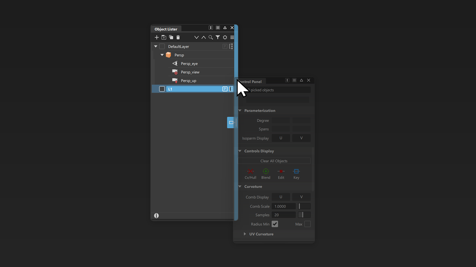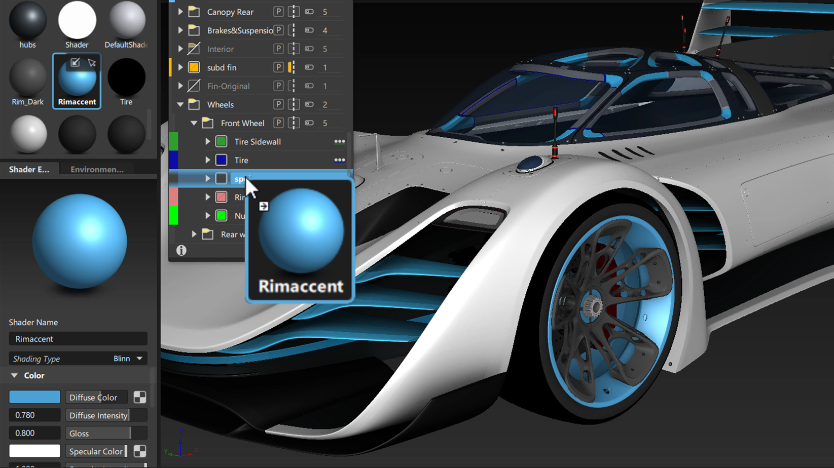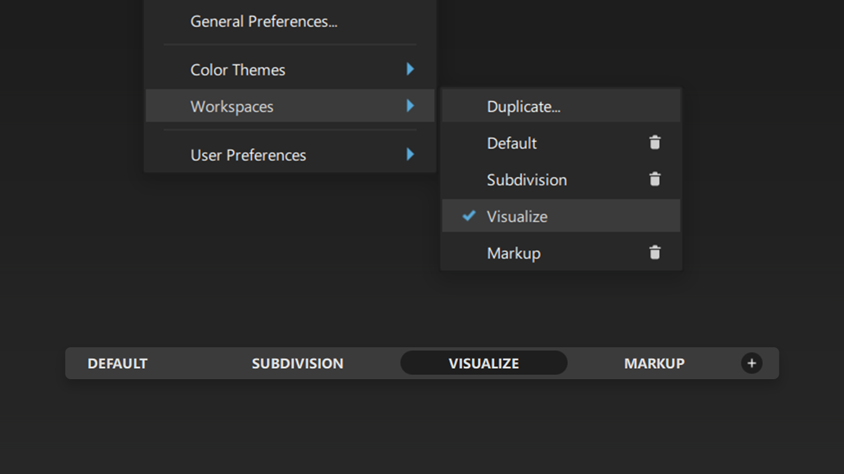 その他の UI カラー テーマ: Alias 2024 には、3 つのユーザ インタフェース カラー テーマが用意されています。既定では、Alias は Light Color テーマで起動します。変更するには、Preferences > Color Themes メニューから Dark Grey Color、Dark Blue Color、または Custom を選択します。選択内容は、Alias の終了時に保存され、次回のセッションで設定されます。