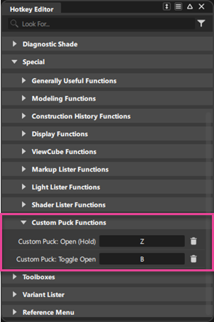 クラッチ キーを設定するオプションをカスタム パックの基本設定から Hotkey Editor に移動しました。カスタム パックを開くホットキーと切り替えるホットキーを、Hotkey Editor の Special > Custom Puc セクションで再設定できるようになりました。既定では、カスタム パックを開く場合に使用するクラッチ キーは引き続き[Z]キーに割り当てられています。