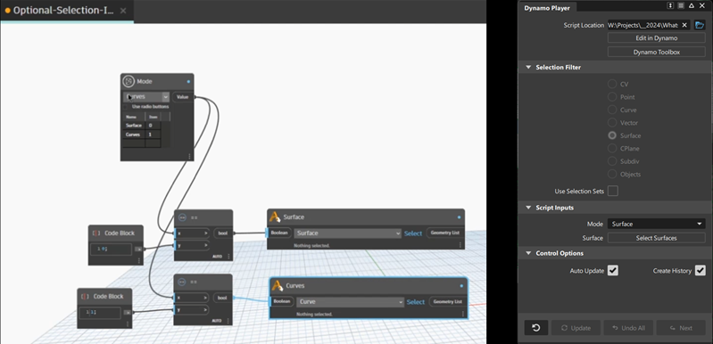 Dynamo 側から Alias の Dynamo プレーヤー ツール ウィンドウの要素の表示をコントロールできるようになりました。これにより、スクリプトに特定のオプションが設定されている場合、現在は不要なスクリプトの入力要素を UI から削除できるため、スクリプトの使用が簡単になります。