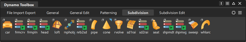 Dynamo ツールボックスが再構築され、タブごとのスクリプトの量が制限されるようになりました。これにより、使用するスクリプトを見つけやすくなります。この改善には、ツールボックスのタブでスクリプトを編成する方法に対する変更も含まれています。関連するすべてのスクリプトに対して、ファイルの読み込みおよび書き出しセクションが新しく追加されました。既存のスクリプトの一部(ポリラインとしての CSV ファイルの読み込みや TSM スクリプトへの書き出しなど)が、この場所に配置されるようになりました。また、新しい読み込みおよび書き出し関連のスクリプトが新しいセクションに追加されました。また、General Edit タブと Subdivision Edit タブが追加され、ジオメトリを作成するのではなく、ジオメトリを修正するすべてのスクリプトがこれらの新しいセクションに移動されました。