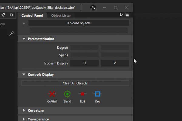 Alias 2025 では、オンボーディングのエクスペリエンスが強化され、最近使用したファイルに簡単にアクセスできるようになりました。リスト ビューでは最近使用したファイルの詳細を確認できます。グリッド ビューに切り替えると、大きなファイルのプレビューを表示したり、ファイルを選択して、作業を終了した時点から作業を継続することができます。