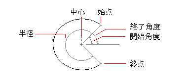 円弧は、常に始点から終点に向けて反時計回りに描かれます。円弧の StartPoint プロパティと EndPoint プロパティは、StartAngle、EndAngle、および Radius プロパティから計算されます。
