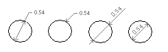 さまざまな種類の直径寸法が、次の値を基に記入されます。円または円弧のサイズ、引出線の長さ、AutoCAD のシステム変数 DIMUPT[寸法値位置指定]、DIMTOFL[寸法線内側記入]、DIMFIT[寸法値フィット]、DIMTIH[補助線内水平]、DIMTOH[補助線外水平]、DIMJUST[寸法値水平位置]、DIMTAD[寸法線上記入]の値。