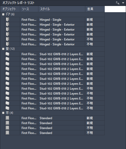 この比較処理は、図面をトレーシング ペーパーまたは透明シートで受け取って、元のプロジェクト図面にかぶせて比較する方法と似ています。図面比較では、使用する図面にあるオブジェクトに関する情報データと、図面画面上のグラフィックス変更が表示されます。