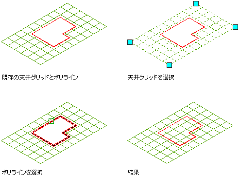 開口が天井グリッドから除去されます。ただし、ポリラインは図面上に残ります。必要に応じて、そのポリラインを削除することができます。