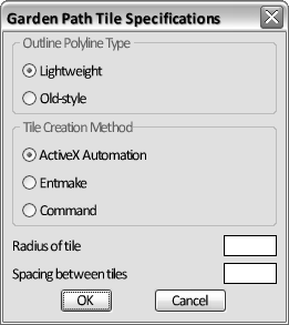 一方の組のボタンは、境界のポリラインのスタイルを決定します。もう一方の組のボタンは、図形作成方法(ActiveX、entmake、または command)を指定します。同じ組のラジオ ボタンで、オンに設定できるのは一度に 1 つだけです。