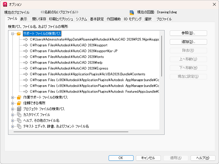 ソース ファイルが AutoCAD のサポート ファイル検索パスにある場合は、ファイル名を指定するとき、パス名を省略できます。検索パスを設定するには、AutoCAD のアプリケーション メニュー [オプション]をクリックし、[ファイル]タブをクリックしてから[サポート ファイルの検索パス]を選択します。