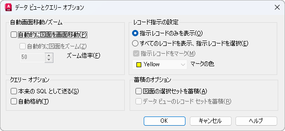 [データ ビュー]ウィンドウで、リンクされているオブジェクトに対応するレコードを選択したときに、そのオブジェクトを現在の図面に表示する方法をコントロールします。