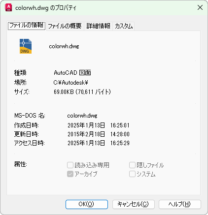 図面ファイルに関する読み込み専用の情報が表示されます。このデータは、オペレーティング システムから取得されます。