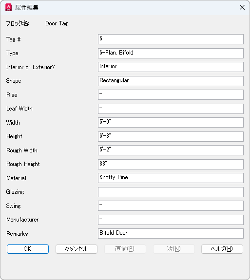 特定のブロックの名前が表示されます。このダイアログ ボックスには、ブロックに含まれている各属性の値が表示されます。