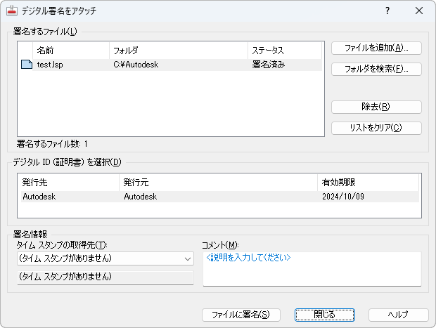 このダイアログ ボックスにリストされているすべてのファイルにデジタル署名をアタッチします。