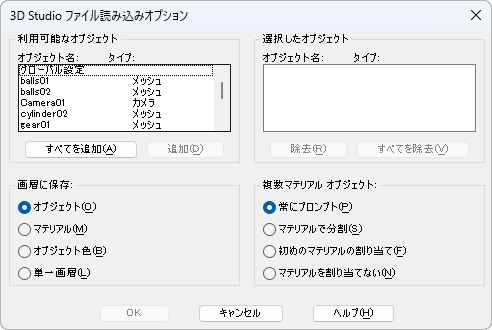 指定した 3D Studio (3DS)ファイル内のすべてのオブジェクトの名前が表示されます。最大 70 のオブジェクトを選択できます。