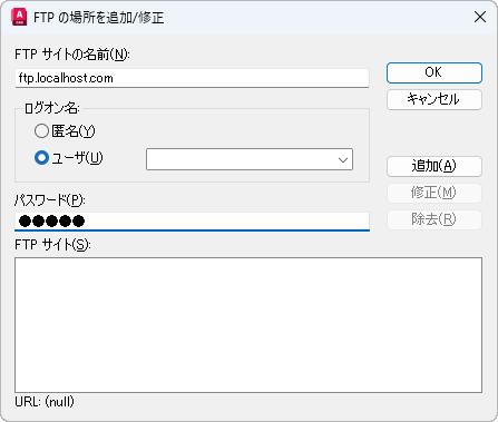 FTP のサイト名を指定します(たとえば、ftp.autodesk.com)。
