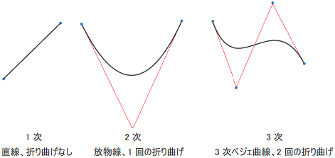 次数 1 の曲線は直線です。次数 2 の曲線は 1 つの曲がりを持ちます。ベジェ曲線の次数は 3 です。次数が高くなるほど曲線は複雑になり、計算量が増加します。