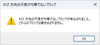 書き出し中に、XYZ 方向の尺度が均等でないブロックが検出され、そのブロック内のオブジェクトは書き出されないことを知らせるダイアログ ボックスが表示されます。