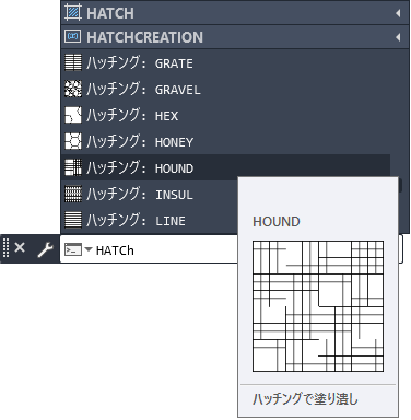 例: ハッチング パターンを挿入する: コマンド プロンプトに対して hatch と入力し、[Tab]キーを押してオプションを切り替えると、使用できるハッチング パターンが含まれるように、コマンド ラインの入力候補リストが展開されます。追加のハッチングやグラデーションを表示するには、スクロール バーをドラッグします。名前にカーソルを合わせることで、各オプションのサムネイルを表示することができます。