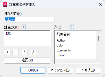 書き出した図面データと外部データ(データがリンクされている場合)の列名を表示します。列名を[計算式]フィールドに追加するときにダブルチェックしたり、[列]一覧から[計算式]フィールドにドラッグすることができます。既存の計算式列は一覧表示されず、計算式列を追加するときの値として使用できません。