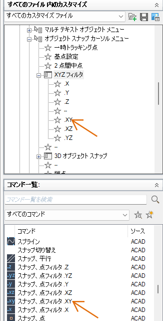 - [カスタマイズ]タブの[コマンド一覧]ペインで、[ <ファイル名> 内のカスタマイズ]ペインのユーザ インタフェース要素に追加するコマンドを検索してドラッグします。