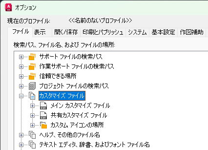 - [オプション]ダイアログボックスの[ファイル]タブで、[カスタマイズ ファイル]の横のプラス(+)記号をクリックしてノードを展開します。