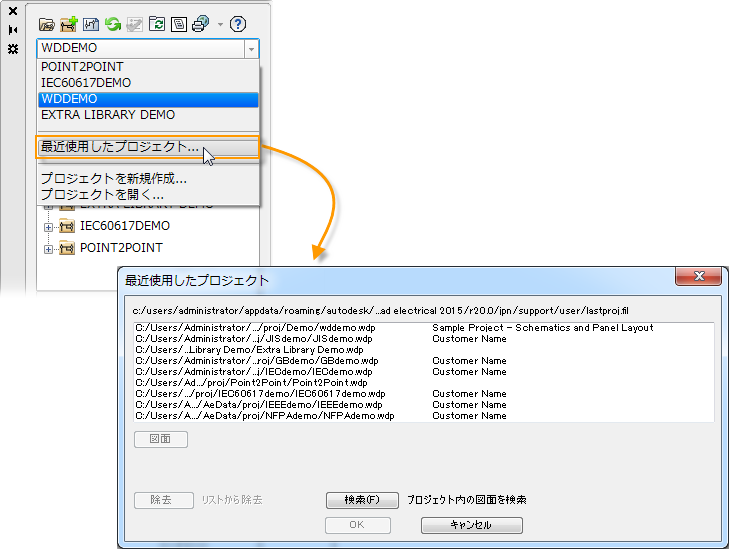 [プロジェクト マネージャ]は、プロジェクトおよびプロジェクトに含まれている図面の作業を行うための付属ツールです。 検索
