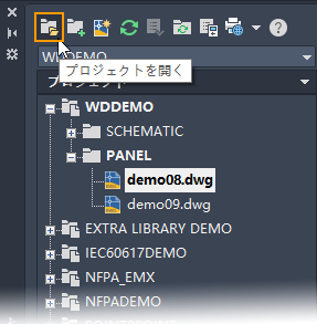 AutoCAD Electrical ツールセット はプロジェクトベースです。プロジェクトとは、相互に関連性を持つ図面のセットです。プロジェクトに含まれている図面など、プロジェクト関連のすべての情報は、拡張子 .wdp の付いたプロジェクト ファイルに保存されます。
