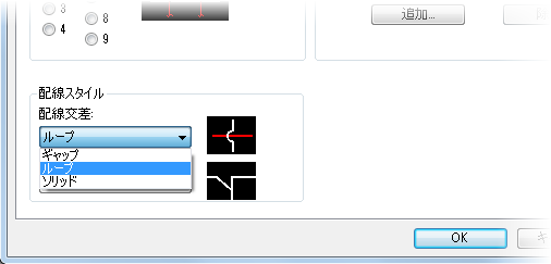 配線が別の配線と交差する場合、[図面プロパティ]ダイアログ ボックスの[スタイル]タブで定義したループまたはギャップを割り当てることができます。