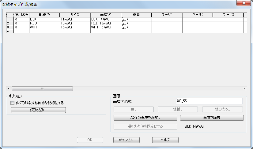 配線画層を作成するには、空白の行に配線色と配線サイズを入力します。既定の画層名が入力されますが、必要に応じて画層名を変更できます。[線番なし]として定義した場合を除き、線番の処理中に線番がすべての画層に追加されます。このオプションは、単線図面などの場合に役立ちます。[色]、[線種]、および[線の太さ]を指定して、画層プロパティを定義します。