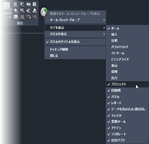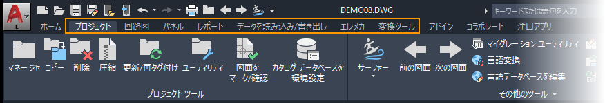 AutoCAD Electrical ツールセット では、作図領域の上部に標準的なタブ リボンが表示されます。また、AutoCAD Electrical ツールセット 固有のタブが AutoCAD リボン タブとともに表示されます。