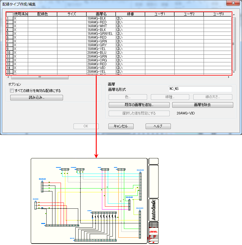 [配線タイプ作成/編集]ツールを使用すると、新しい配線タイプを作成したり、既存の配線タイプを編集できます。また、[配線タイプ変更/変換]ツールを使用すると、線分を配線に変換できます。配線画層名および関連する配線プロパティ(配線の色、サイズ、配線画層を線番付けの対象にするかどうか)が図面ファイルに保存されます。次の規則により、新しい配線の配線画層が決まります。
