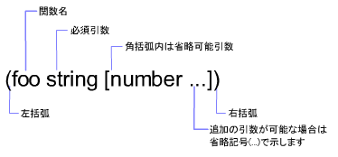 この例では、foo 関数には 1 つの必須引数 string (文字列データ タイプ)と 1 つまたは複数の省略可能な引数 number (数値)があります。引数 number は、整数または実数のデータ タイプにすることができます。一般に、引数の名前は予期されるデータ タイプを表しています。次の表の例に、foo 関数の有効な呼び出しと無効な呼び出しを示します。