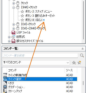 マウス ボタンに追加するコマンドを、[コマンド一覧]ペインから[