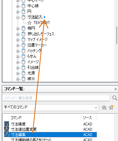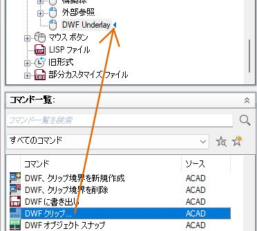 - ダブルクリック アクションに追加するコマンドを、[コマンド一覧]ペインから[ <ファイル名> 内のカスタマイズ]ペインにドラッグします。