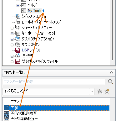 コマンドを、[コマンド一覧]ペインから[ <ファイル名> 内のカスタマイズ]ペインのプルダウン メニューまたはプルダウン メニューより下位の場所にドラッグします。