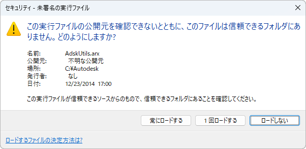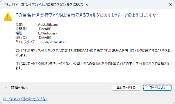 解決策: ファイルをロードし、予定通りに使用します。必要に応じて、この発行元を信頼して、この発行元の署名があるファイルのすべてにメッセージ ボックスが表示されないようにします。