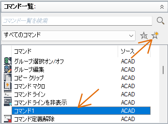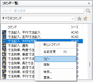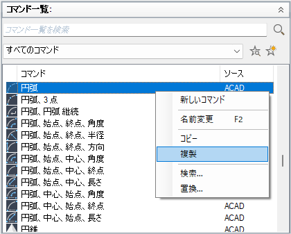 - [カスタマイズ]タブの[コマンド一覧]ペインで、複製を作成するコマンドを探します。
