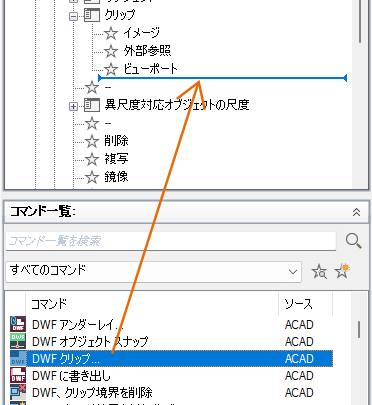 - [カスタマイズ]タブの[コマンド一覧]ペインで、コピーするコマンドを探します。
