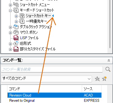 • ショートカット キーを作成するには、[コマンド一覧]ペインから、コマンドを[<ファイル名> 内のカスタマイズ]の[ショートカット キー]ノードにドラッグします。