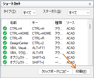- [ショートカット]ペインで、印刷するキーボード ショートカットのタイプとステータスをフィルタします。