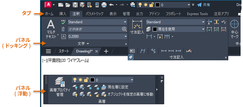 リボン タブのパネルは、アプリケーション ウィンドウで浮動状態にすることができます。リボン パネルが浮動状態の場合、どのリボン タブがアクティブであるかに関係なく表示されます。これは、いkつかの異なるタイプのツールを頻繁に切り替える場合に非常に便利です。たとえば、[画層]パネルまたは[プロパティ]パネルを浮動状態にして、[挿入]タブや[注釈]タブが現在のタブの場合でも表示されるようにすることができます。