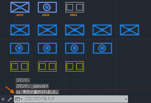 ブロック A410 および B464 のすべてのインスタンスが選択され、正確な数がコマンド ウィンドウに表示されます。