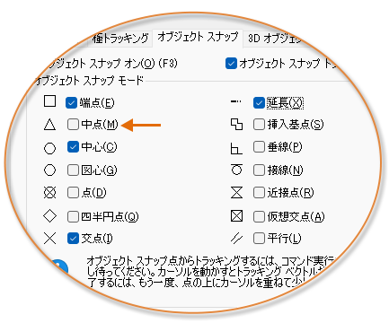 「定常オブジェクト スナップ」と呼ばれる既定のオブジェクト スナップを設定するには、OSNAP[オブジェクト スナップ設定]コマンドを使用します。たとえば、[中点]オブジェクト スナップを既定でオンにしておくと便利な場合があります。